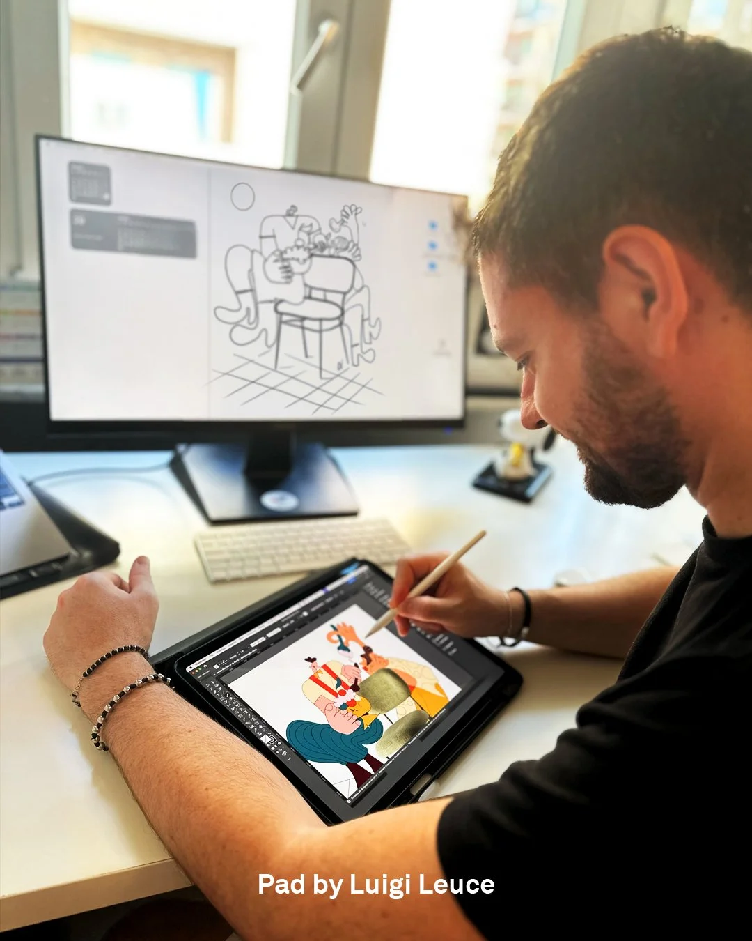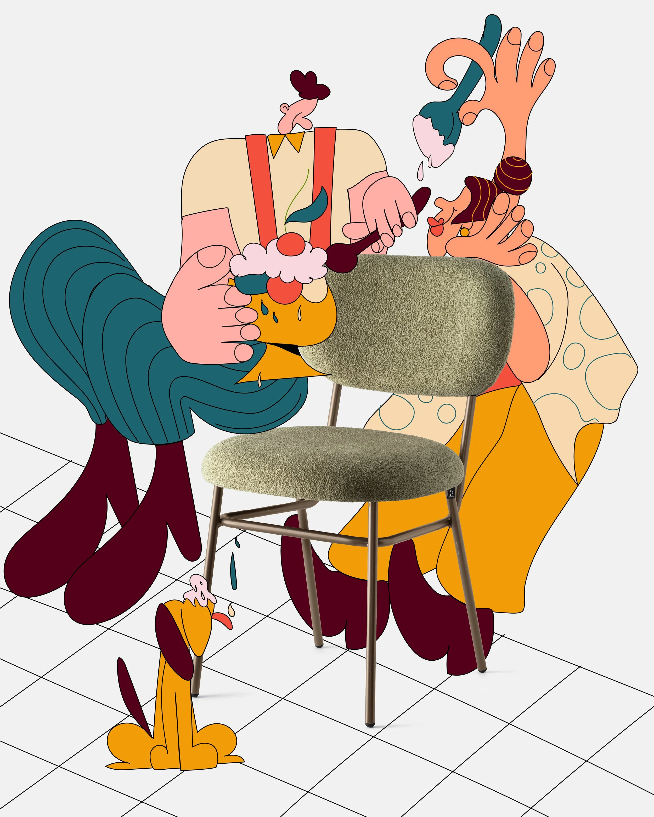 Per il brand Connubia ho interpretato il visual di un loro oggetto di design, la sedia PAD. Mi è stato chiesto di interpretare e disegnare qualcosa attorno a questo modello di sedia e io ho pensato alla condivisione inserendo una ciliegina… sul gelato, tanti sorrisi e la bellezza dello stare insieme. Il visual è stato pubblicato sui canali social del Brand per sponsorizzare la sedia.